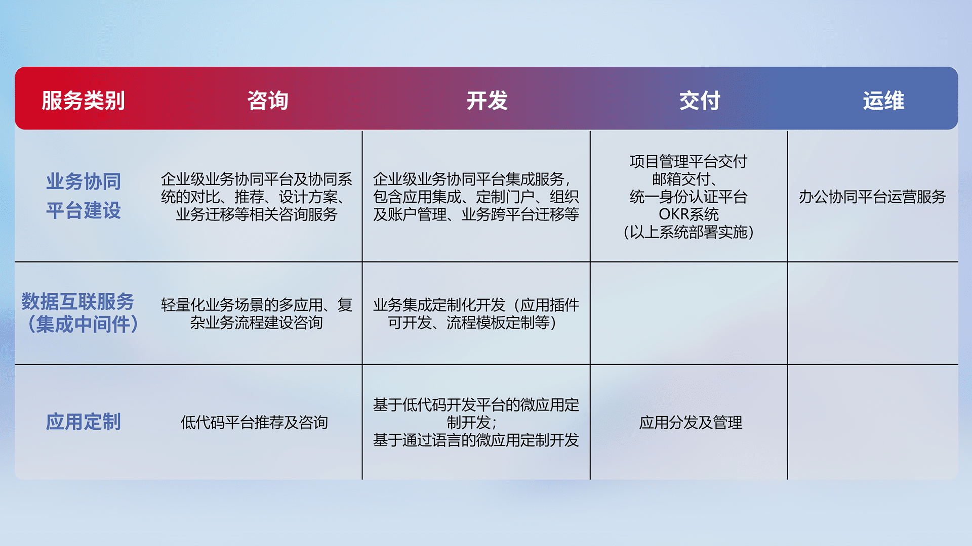 针对钉钉、、企微、、IDaas等平台级产品提供产品的规划、、方案、、交付、、定制化开发等服务,,实现如统一协同办公、、、、智能客户服务、、混合会议管理、、、、智能数据查询、、等业务场景,,,,实现数字化转型。。