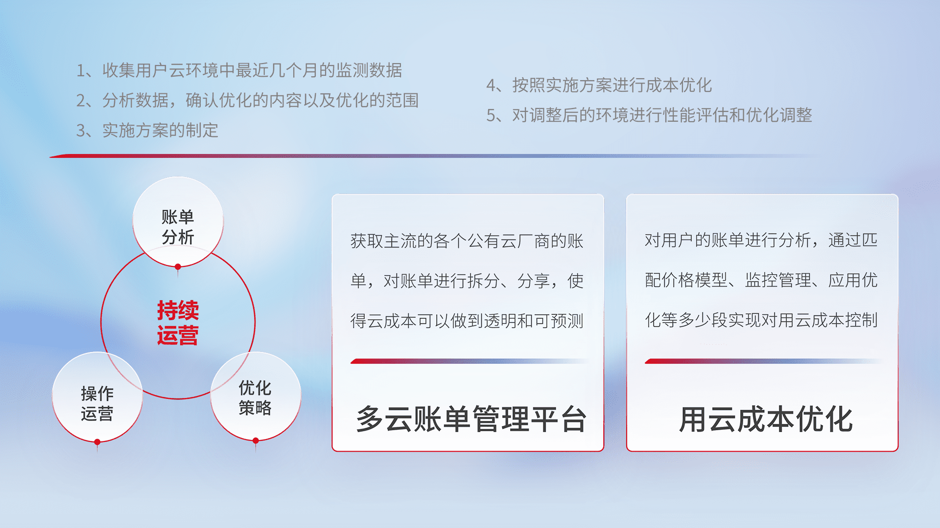 通过多云纳管,,以统一的资源数据模型把客户的云资源进行抽象和封装,,进而实现对多云资源的统一操作,,,,保障云资源管理的可靠性、、、稳定性与可用性。。。。量身定制化运维内容,,配置、、开发运维、、、补丁管理、、、、备份、、、、监控、、、、认证和访问管理、、、、审计和日常巡检等,,保障在用云过程中的可靠度,,,稳定度以及高可用率。。。